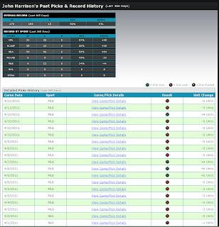 To be fair to his service, I've only been on board for half of the NBA season, and a week of the MLB season. However, I went through a few months of the NCAAB season and he hardly made any picks on college hoops (he recommended Abrams for that). That means he sat at all but one pick on the NCAA Tournament, and that pick was a 5 unit loss that missed covering by about 160% of the spread. He also completely skipped the NHL season. He didn't make a single hockey pick. I'm not sure if he's going to touch the NHL playoffs, but my guess is he will not. The flip side of that is that he still has the NBA playoffs, nearly a full season of MLB and the MLB playoffs, the NFL season, and NCAAF to get back on track. I don't know if he will or not. My hope is that he's correct, and that he can pull 100+ units in the course of a year, because that would put us on track for +150 units over the next 9-10 months. I'm not holding my breath though.